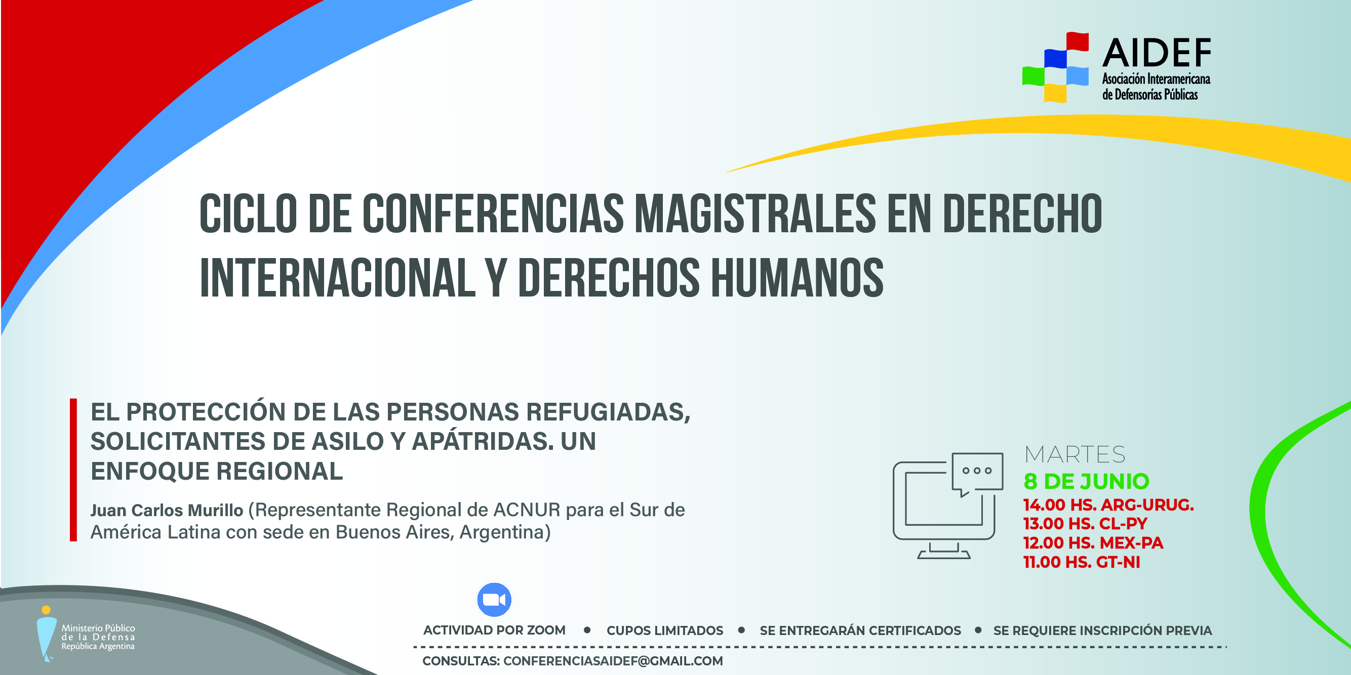 Este martes 8 de junio a las 14 h de Argentina (ver horario para otros países en el flyer), el representante regional del Alto Comisionado de las Naciones Unidas para los Refugiados (ACNUR) para el Sur de América Latina, Dr. Juan Carlos Murillo, brindará la conferencia “Protección de las personas refugiadas, solicitantes de asilo y apátridas. Un enfoque regional”. La actividad se realizará en el marco del Ciclo de Conferencias Magistrales en Derecho Internacional y Derechos Humanos que organizan en conjunto la Asociación Interamericana de Defensorías Públicas (AIDEF) y el Ministerio Público de la Defensa de la República Argentina (MPD).