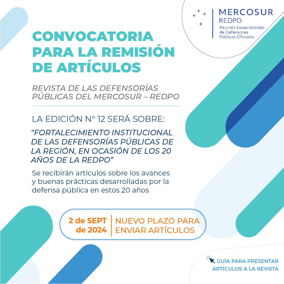 Extendemos a los y las integrantes del Ministerio Público de la Defensa la convocatoria al envío de artículos para la próxima edición de la Revista de la Reunión Especializada de Defensoría Públicas Oficiales (REDPO) del Mercosur.