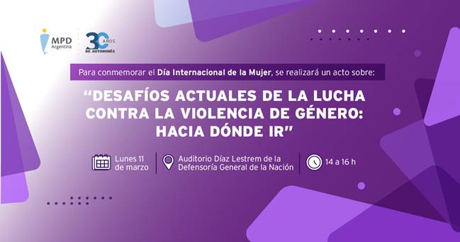 Con motivo del Día Internacional de la Mujer, la Defensora General de la Nación, Dra. Stella Maris Martínez, encabezará el encuentro “Desafíos actuales de la lucha contra la violencia de género: hacia dónde ir”. La actividad se realizará el día de hoy, de 14 a 16 h, en el Salón Auditorio Dr. Guillermo Díaz Lestrem de la Defensoría General de la Nación (Av. Callao 970, PB).