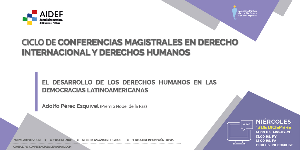 Con motivo de la celebración del Día Internacional de los Derechos Humanos, el Ministerio Público de la Defensa (MPD) y la Asociación Interamericana de Defensorías Públicas (AIDEF) invitan a participar de la charla “El desarrollo de los Derechos Humanos en las Democracias Latinoamericanas” que brindará el Premio Nobel de la Paz de 1980, Adolfo Pérez Esquivel. La actividad se realizará el próximo miércoles 13 de diciembre a las 14 horas en el marco del Ciclo de Conferencias Magistrales en Derecho Internacional y Derechos Humanos que organizan en conjunto el MPD y la AIDEF.