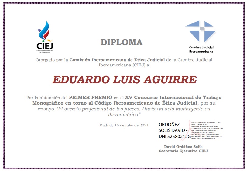 En esta oportunidad, el tema desarrollado por los nueve participantes procedentes de Argentina, República Dominicana, Colombia, Ecuador, Honduras y México, fue el “secreto profesional”. El Dr. Aguirre formó parte del mismo y obtuvo la premiación mayor del concurso con su ensayo “El secreto profesional de los jueces. Hacia un acto instituyente en Iberoamérica”.