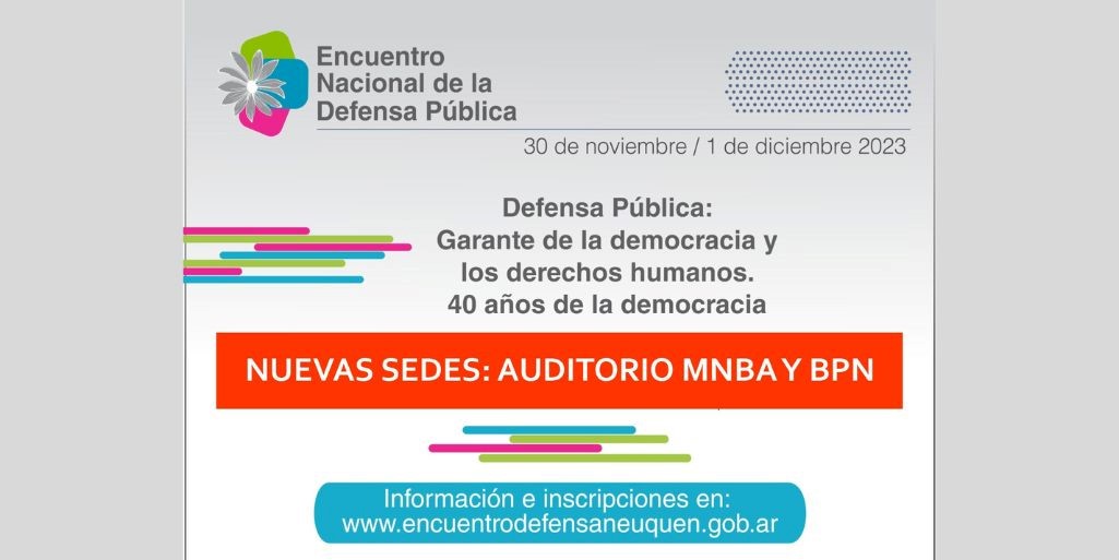 Los días 30 de noviembre y 1 de diciembre se realizará en la provincia de Neuquén el Encuentro Nacional de la Defensa Pública. La actividad cambió su sede y se desarrollará en los Auditorios del Museo Nacional de Bellas Artes y del Banco Provincia del Neuquén, ubicados en la ciudad de Neuquén.