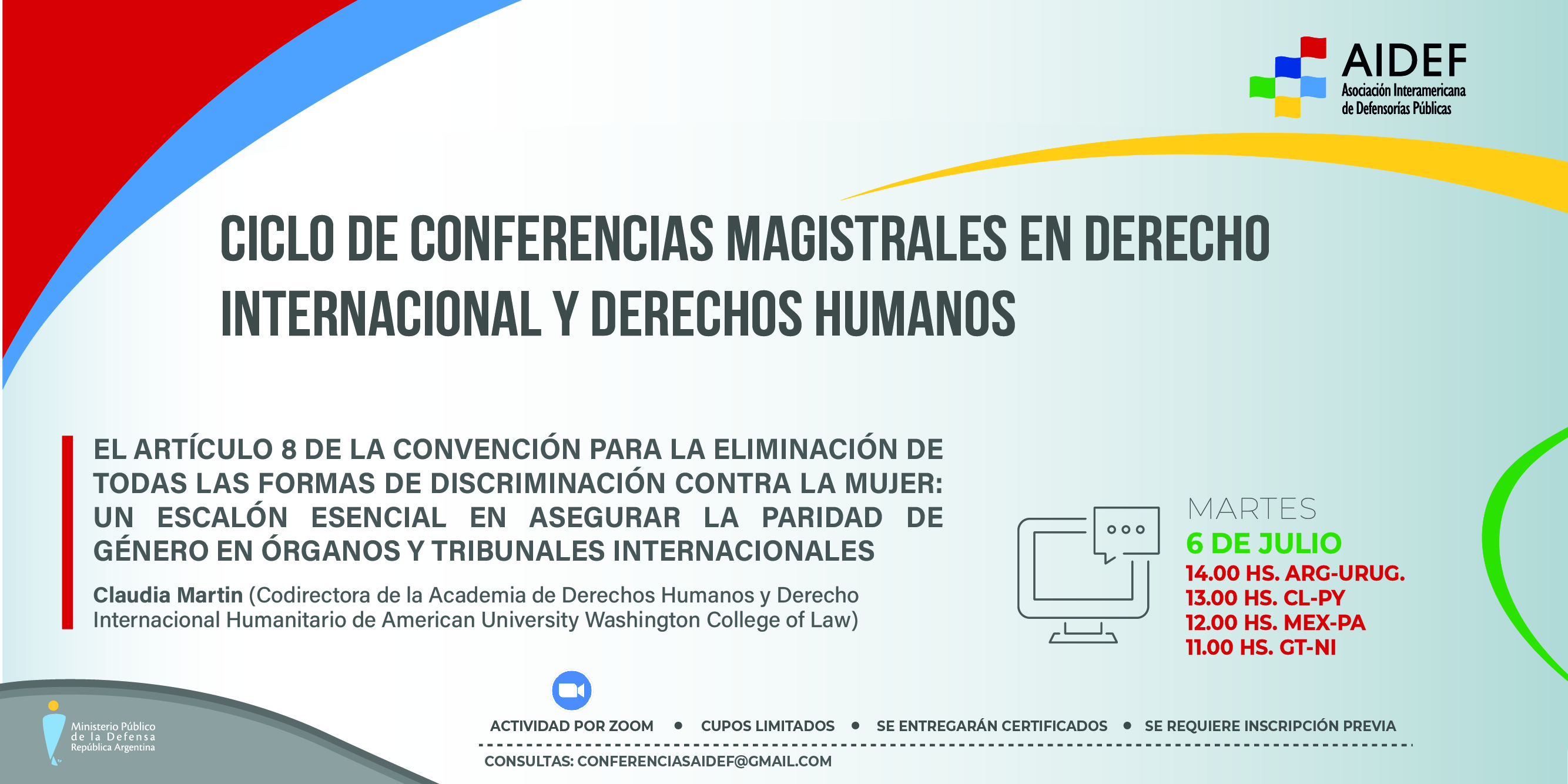 El próximo martes 6 de julio a las 14 h de Argentina (ver horario para otros países en el flyer), la codirectora de la Academia de Derechos Humanos y Derecho Internacional Humanitario de American University Wshington College of Law, Dra. Claudia Martin, brindará la conferencia "El artículo 8 de la Convención para la eliminación de todas las formas de discriminación contra la mujer: un escalón esencial para asegurar la paridad de género en órganos y tribunales internacionales". La actividad se realizará en el marco del Ciclo de Conferencias Magistrales en Derecho Internacional y Derechos Humanos que organizan en conjunto la Asociación Interamericana de Defensorías Públicas (AIDEF) y el Ministerio Público de la Defensa de la República Argentina (MPD).