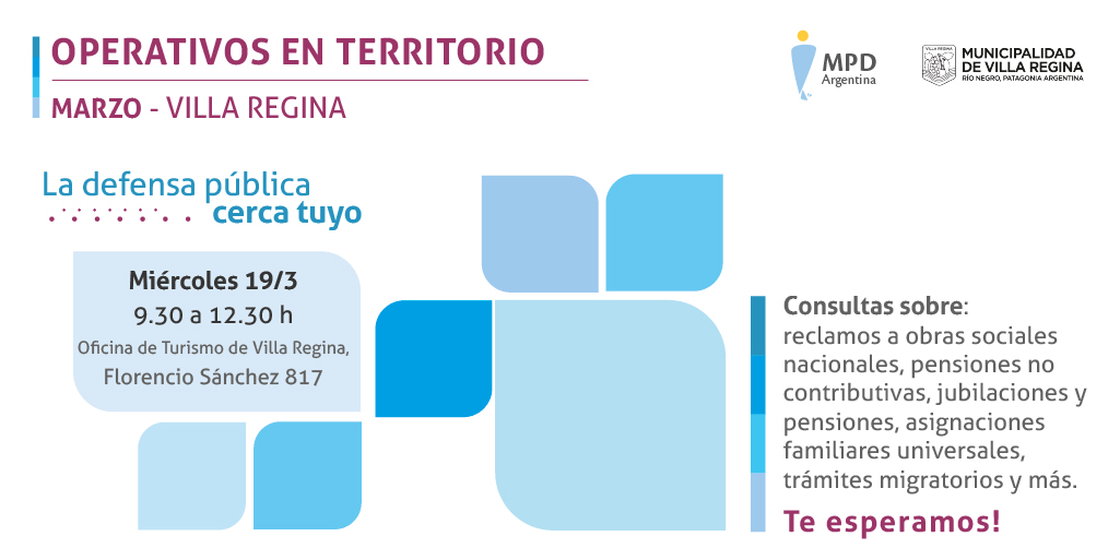 El próximo miércoles 19 de marzo, de 9.30 a 12.30 h, se realizará el operativo territorial de atención "La Defensa Pública Cerca Tuyo", donde personal de la Unidad de defensa en materia no penal (a cargo del Dr. Eduardo Peralta) que forma parte de la Coordinación General de Defensa de la Jurisdicción General Roca y de la Municipalidad de Villa Regina estará disponible para evacuar consultas y brindar asesoramiento jurídico gratuito a los vecinos y vecinas de esa ciudad.