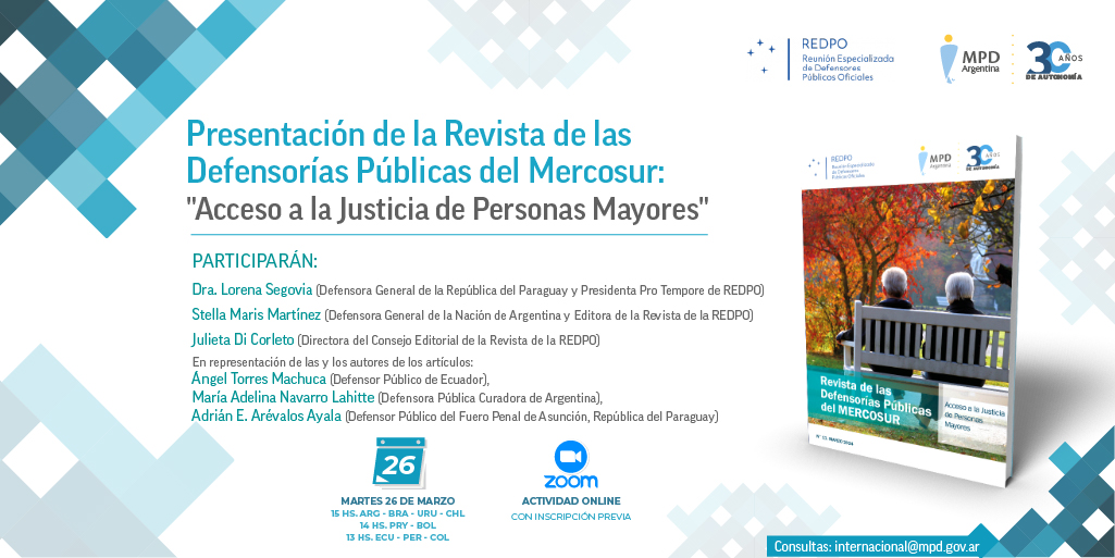 La Reunión Especializada de Defensorías Públicas Oficiales del Mercosur (REDPO) invita a participar de la presentación del número 11 de su Revista, titulado “Acceso a la justicia de las personas mayores” y que editó el Ministerio Público de la Defensa de Argentina.