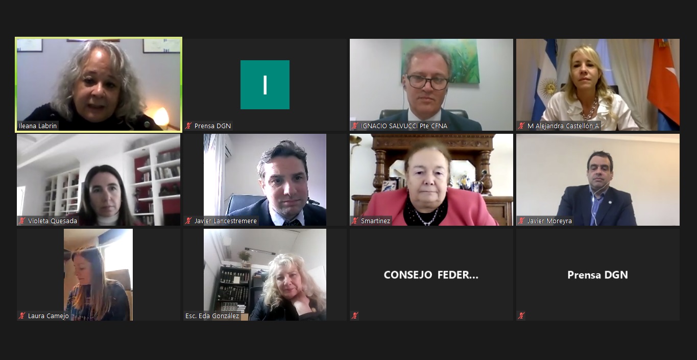 Hoy al mediodía se llevó adelante una videoconferencia en donde fue presentado un convenio marco de colaboración institucional que firmaron el Ministerio Público de la Defensa (MPD) y el Consejo Federal del Notariado Argentino (CFNA). Participaron del evento la defensora general de la Nación, Dra. Stella Maris Martínez; el secretario general de la Secretaría de Política Institucional de la Defensoría General de la Nación (DGN), Dr. Javier Lancestremere; a responsable del área de Fortalecimiento Institucional de la DGN, Dra. Violeta Quesada; y el escribano Ignacio Salvucci, presidente del CFNA; entre otros.