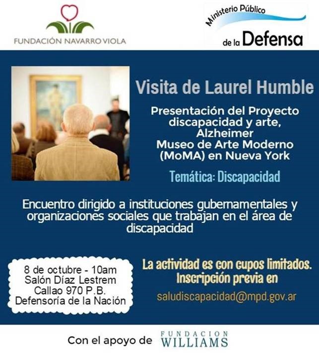 En el salón Díaz Lestrem de la Defensoría General de la Nación (Callao 970 PB) se presentó el proyecto “Discapacidad y arte, Alzheimer”, con la presencia de Laurel Humble, del Alzheimer's Project del Museo de Arte Moderno de Nueva York, EE.UU.