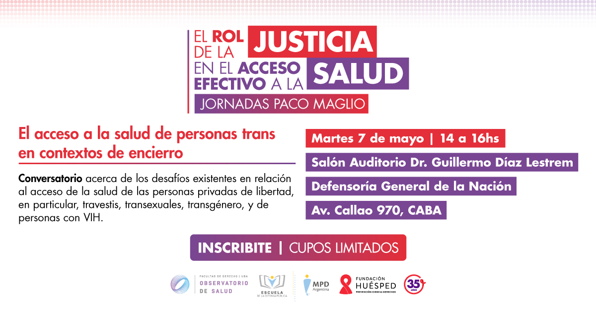 El próximo martes 7 de mayo, de 14:30 a 16 h., la Escuela de la Defensa Pública del Ministerio Público de la Defensa (MPD) realizará el curso “El acceso a la salud de personas trans en contextos de encierro” que forma parte de las “Jornadas Paco Maglio. El rol de la justicia en el acceso efectivo a la salud”. La actividad otorga un crédito y se realizará en el auditorio Guillermo Díaz Lestrem de la Defensoría General de la Nación (Av. Callao 970).