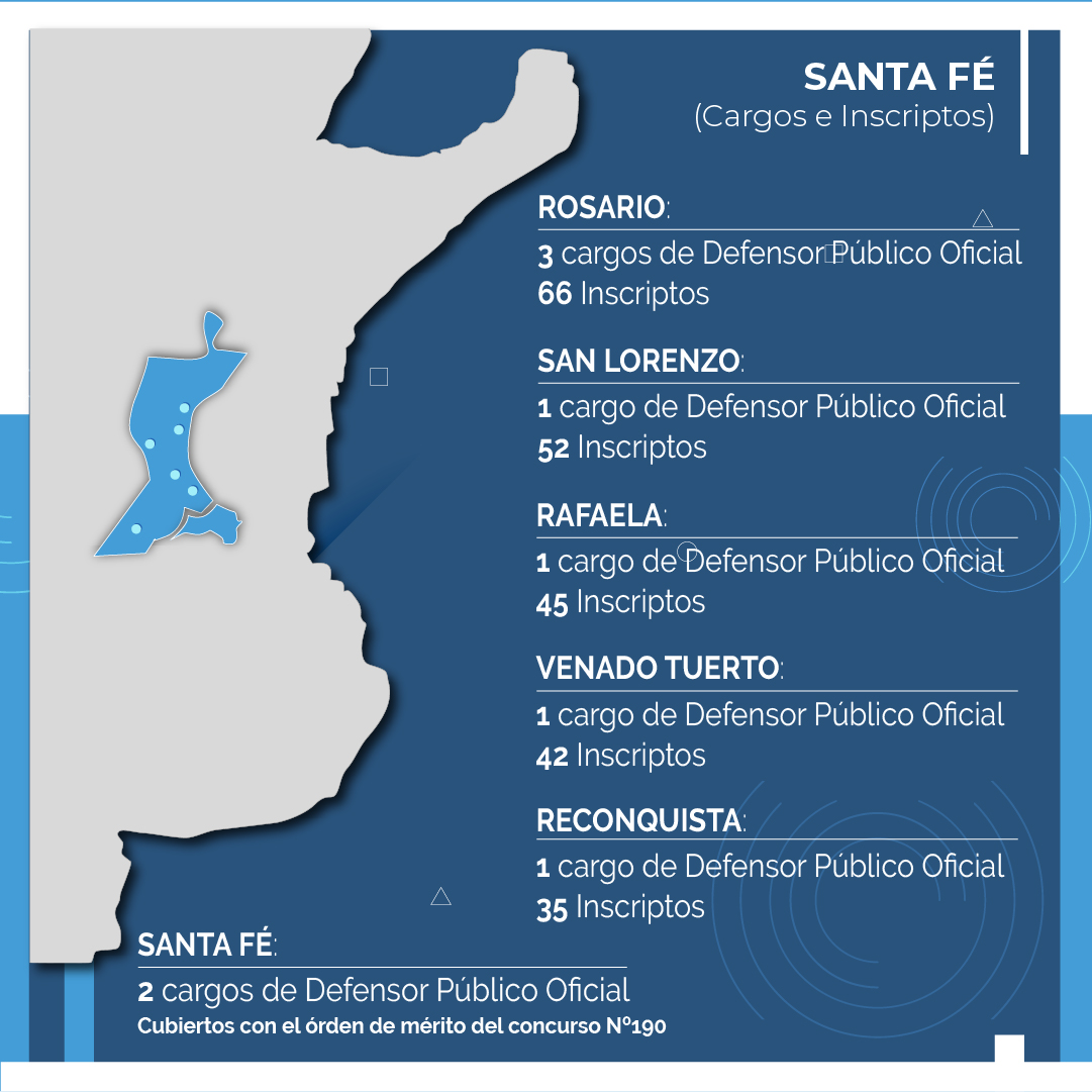 Es importante aclarar que para los dos cargos defensor/a público/a oficial que la Ley 27.715 creó con asiento en la ciudad de Santa Fe se aplicó el orden de mérito que había sido obtenido en el Concurso Nº190 MPD, convocado oportunamente para cubrir el cargo vacante de defensor/a público/a oficial ante el Tribunal Oral en lo Criminal Federal de Santa Fe. Esta situación se encuentra prevista en el Reglamento de Concursos del MPD.
