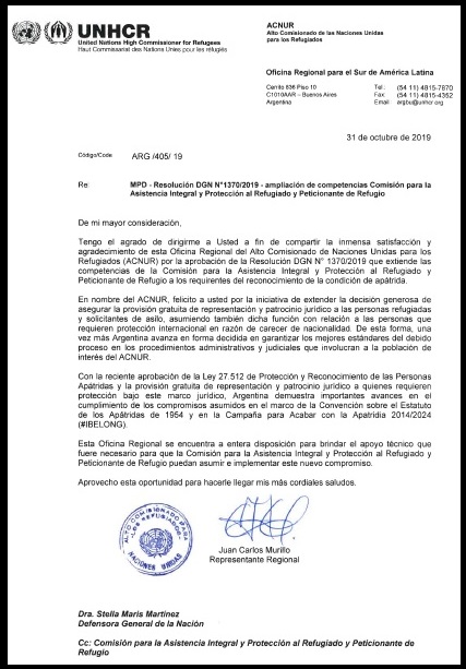 La felicitación, dirigida a la defensora general el pasado 31 de octubre, se materializó en una carta que lleva la firma del Representante Regional de ACNUR para el sur de América Latina, Juan Carlos Murillo. Allí se afirma que “la decisión generosa de asegurar la provisión gratuita de representación y patrocinio jurídico […] a las personas que requieren protección internacional en razón de carecer de nacionalidad” significa un avance de Argentina hacia “garantizar los mejores estándares del debido proceso en los procedimientos administrativos y judiciales que involucran a la población de interés de ACNUR”.