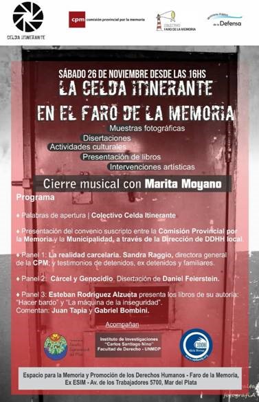 Con el auspicio del Ministerio Público de la Defensa, el sábado 26 de noviembre, a las 16 h, se realizarán una serie de actividades culturales en el marco de la tercera edición del ciclo “La celda itinerante”, en la ciudad de Mar del Plata.