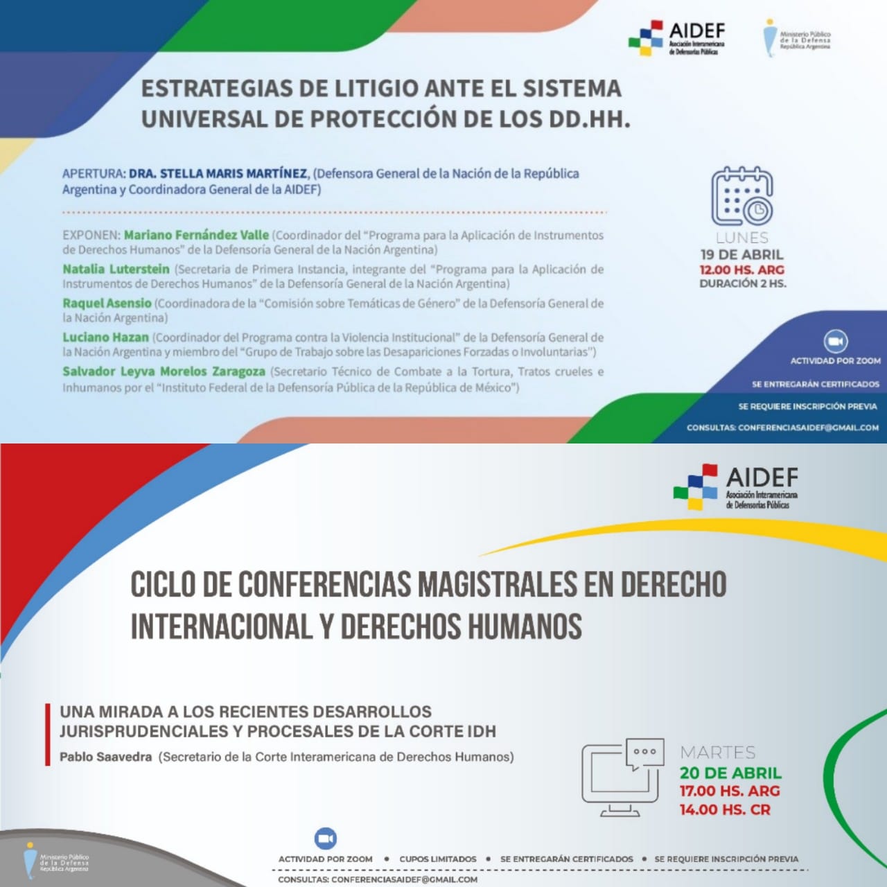 Por otra parte, en el día de ayer se llevó adelante la tercera conferencia magistral en Derecho Internacional y Derechos Humanos que presenta AIDEF con la disertación “Una mirada de los recientes desarrollos jurisprudenciales y procesales de la Corte IDH”, dictada por el Dr. Pablo Saavedra, secretario de la Corte Interamericana de Derechos Humanos (Corte IDH).