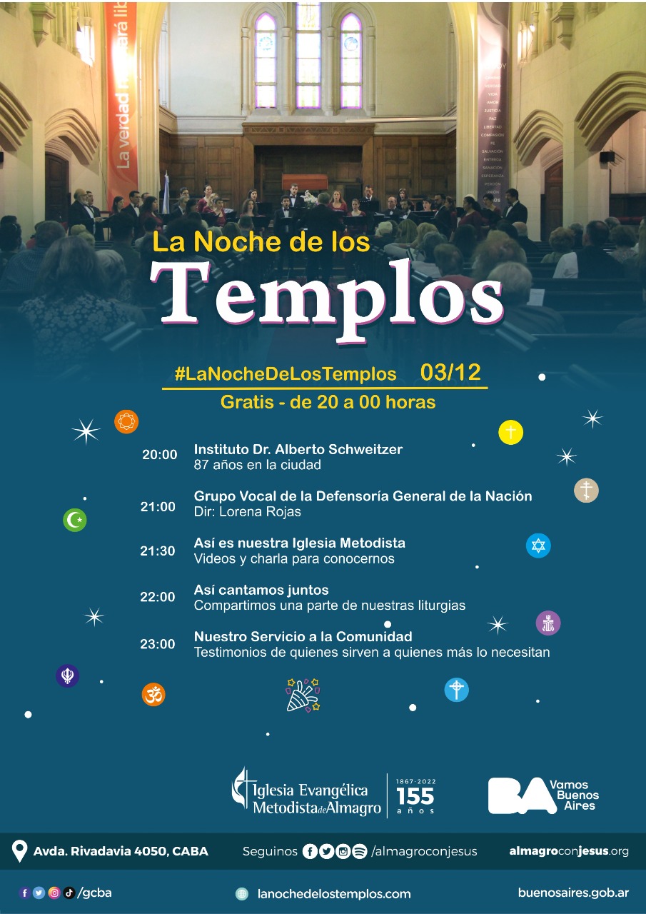 La presentación de nuestro coro institucional, dirigido por Lorena Rojas, tendrá lugar en el marco de la iniciativa “La Noche de los Templos”, auspiciada por el Gobierno de la Ciudad Autónoma de Buenos Aires. La actividad nocturna, que se brindará de manera gratuita e iniciará a las 20 h y concluirá a la medianoche, además del concierto, contará con otras ofertas culturales que se detallan en la imagen.