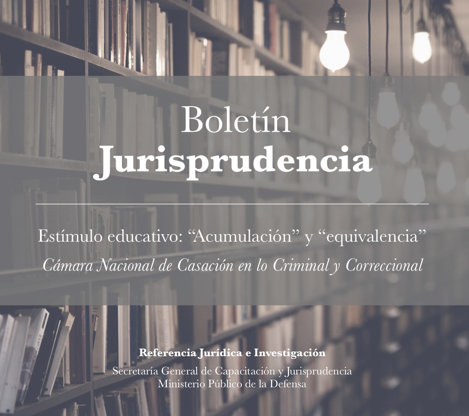 El equipo de Referencia Jurídica e Investigación de la Secretaría General de Capacitación y Jurisprudencia de la Defensoría General de la Nación elaboró un boletín en el que reunió los criterios de los jueces de la Cámara Nacional de Casación en lo Criminal y Correccional sobre la aplicación del estímulo educativo. Específicamente, se abordó la interpretación del concepto de “estudios equivalentes” y la acumulación de los plazos a los que refiere el artículo 140 de la ley Nº 24.660.