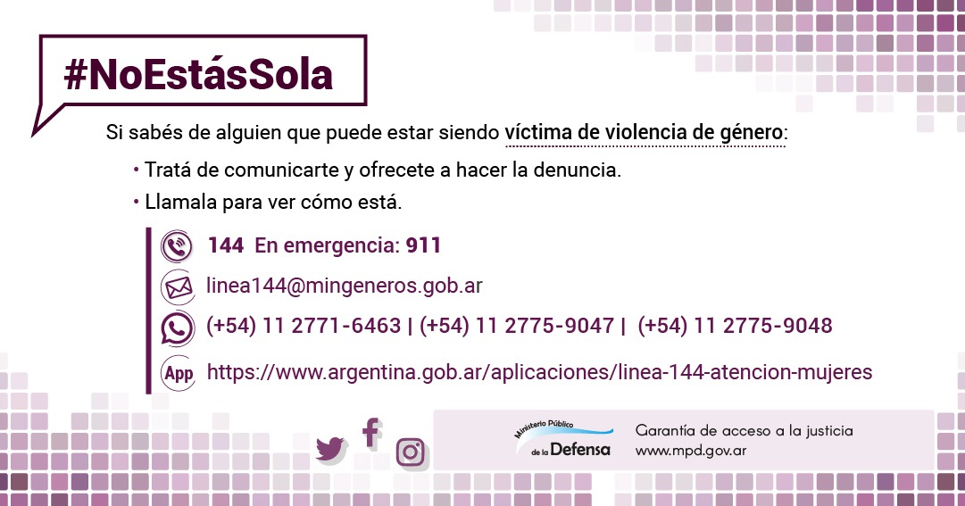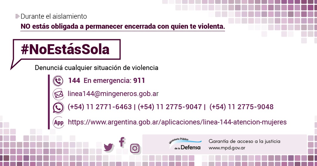 La Comisión de Género de la Defensoría General de la Nación realizó una campaña para difundir las herramientas que tienen las mujeres para hacer frente a la violencia de género en el ámbito familiar durante el aislamiento social, preventivo y obligatorio. Si bien son recursos que están disponibles en cualquier situación, se hace imprescindible aumentar su difusión por la situación extraordinaria de confinamiento sostenido.