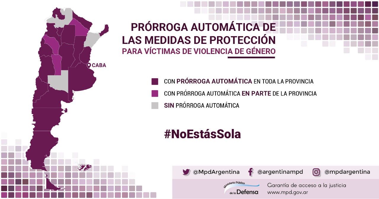 En este sentido, desde la comisión se impulsó la prórroga automática de medidas de protección obtenidas en procesos de violencia. La Cámara Civil fue la primera en adoptar una decisión de este tipo y dispuso, el 19 de marzo, la prórroga automática por 60 días. Luego, la mayoría de las provincias adoptaron medidas similares.