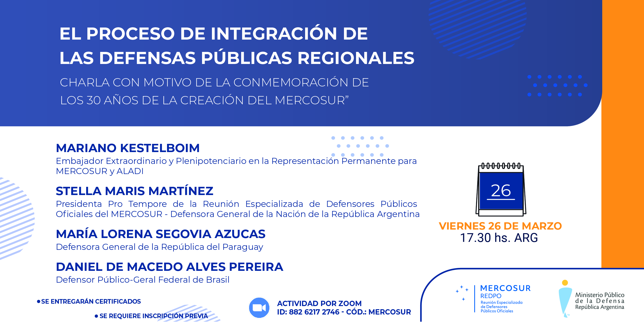 Con motivo de la conmemoración de los 30 años de la creación del Mercado Común del Sur (MERCOSUR), se realizará el próximo viernes a las 17:30 h. a través de la plataforma Zoom la charla “El proceso de integración de las defensorías públicas regionales”. Participarán como oradores la Dra. Stella Maris Martínez, defensora general de la Nación y presidenta pro tempore de la Reunión Especializada de Defensores Públicos Oficiales del MERCOSUR (REDPO); el Dr. Mariano Kestelboim, embajador extraordinario y plenipotenciario en la representación permanente para MERCOSUR y la Asociación Latinoamericana de Integración (ALADI); la Dra. María Lorena Segovia Azucas, defensora general de la República del Paraguay; y el Dr. Daniel De Macedo Alves Pereira, defensor público general Federal de Brasil.