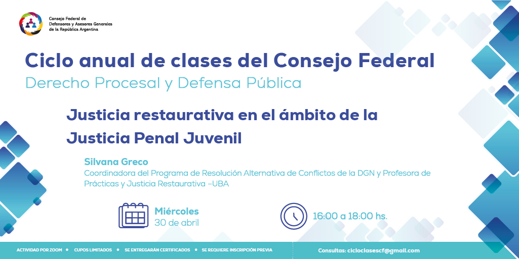 El próximo miércoles 30 de abril, de 16 a 18 h, tendrá lugar la conferencia “Justicia Restaurativa en el ámbito de la Justicia Penal Juvenil”, que dictará la Dra. Silvana Greco (Coordinadora del Programa de Resolución Alternativa de Conflictos de la DGN y Profesora de Prácticas y Justicia Restaurativa – UBA).