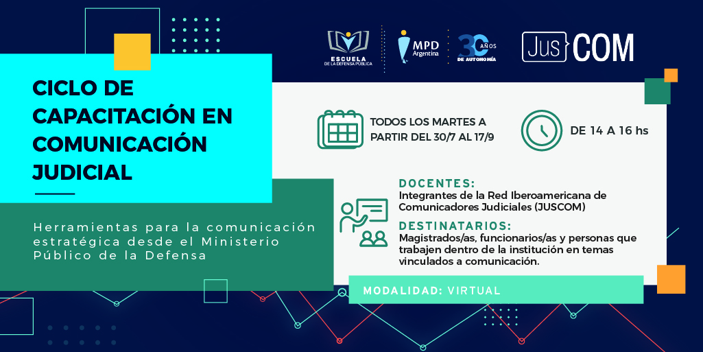 El próximo martes 30 de julio comienza el “Ciclo de capacitación en comunicación judicial. Herramientas para la comunicación estratégica desde el Ministerio Público de la Defensa (MPD)”, destinado a magistrados/as, funcionarios/as y personal especializado en comunicación del MPD. La capacitación se realiza en el marco del convenio que firmaron la Defensoría General de la Nación y la Asociación Iberoamericana de Profesionales de la Comunicación Judicial (JusCom).