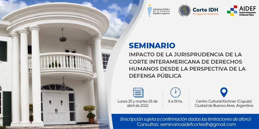 El próximo jueves 31 de marzo cierra la pre-inscripción al seminario "Impacto de la jurisprudencia de la Corte Interamericana de Derechos Humanos desde la perspectiva de la defensa pública”, organizado por la Asociación Interamericana de Defensorías Públicas (AIDEF), la Corte Interamericana de Derechos Humanos (Corte IDH) y el Ministerio Público de la Defensa de la Nación (MPD).
