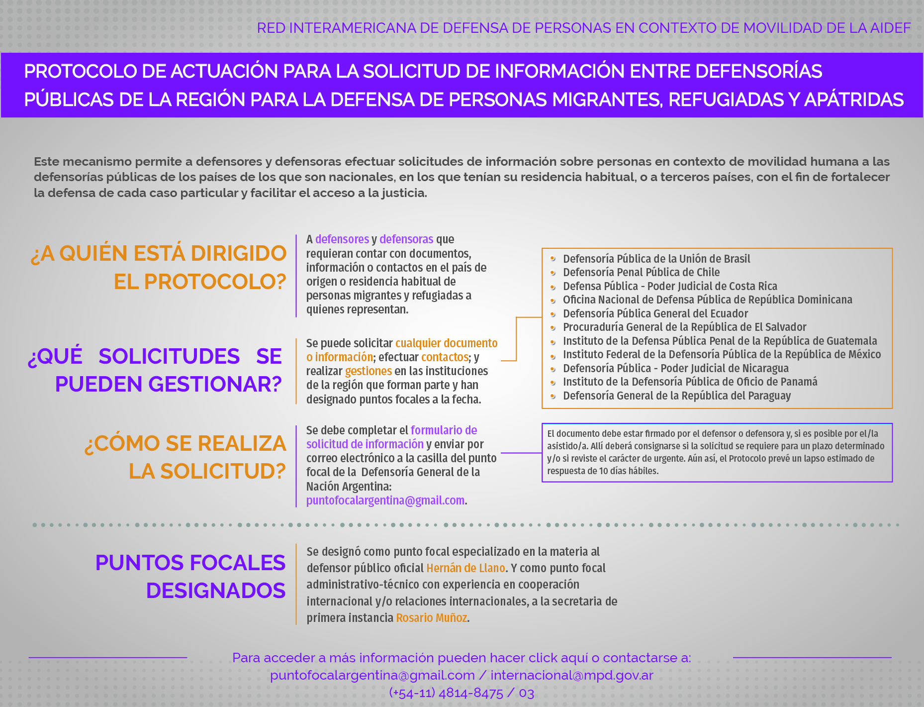En el marco de la Red Interamericana de Defensa de Personas en Contexto de Movilidad implementada por la Asociación Interamericana de Defensorías Públicas (AIDEF), comenzó a funcionar el "Protocolo de actuación para la solicitud de información entre defensorías públicas de la región para la defensa de personas migrantes, refugiadas y apátridas".