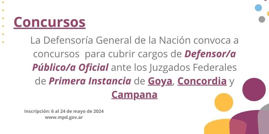 La Defensoría General de la Nación (DGN), a través de la Resolución DGN N°297/24, convoca a concursos públicos de antecedentes y oposición para cubrir cargos de Defensor/a Público/a Oficial ante el Juzgado Federal de Primera Instancia de Goya, provincia de Corrientes (CONCURSO Nº217); Defensor Público Oficial ante el Juzgado Federal de Primera Instancia de Concordia, provincia de Entre Ríos (CONCURSO Nº218) y Defensor Público Oficial ante el Juzgado Federal de Primera Instancia de Campana, provincia de Buenos Aires (CONCURSO Nº219, MPD).