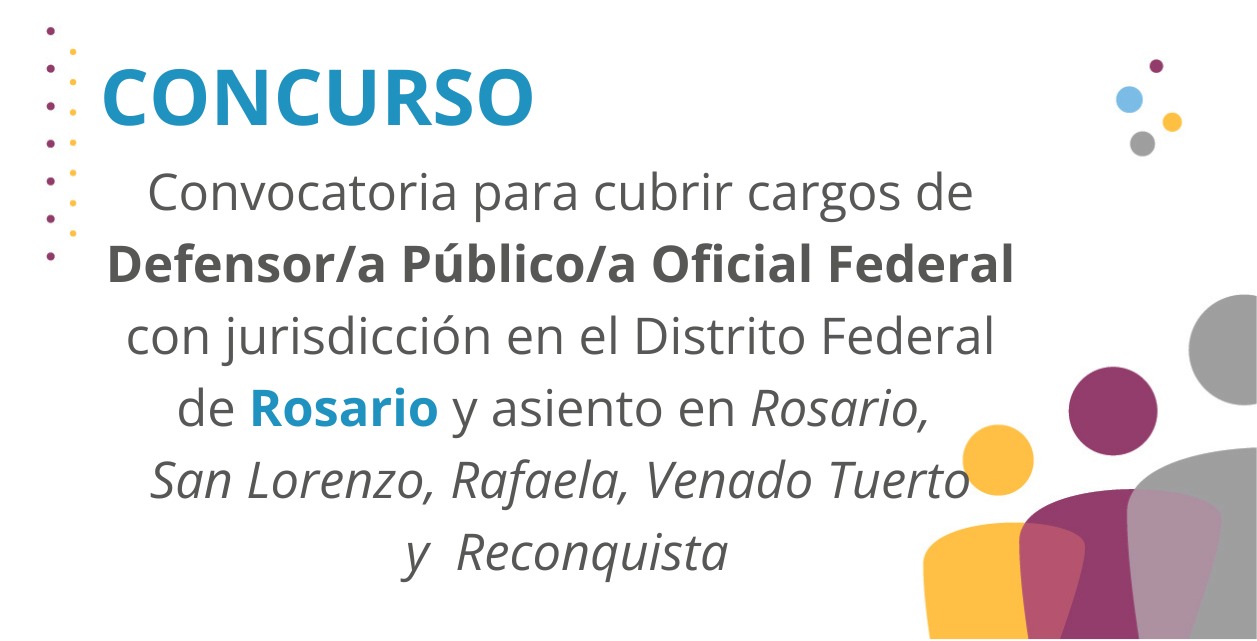 La Defensoría General de la Nación (DGN), a través de la Resolución DGN N°1090/23, convoca a concursos públicos de antecedentes y oposición para cubrir cargos de defensor/a público/a oficial federal de Rosario con asiento en la ciudad de Rosario -3 cargos- (CONCURSO Nº207, MPD); defensor/a público/a oficial federal con jurisdicción en el distrito federal de Rosario y asiento en la ciudad de Rafaela (CONCURSO Nº208, MPD); defensor/a público/a oficial federal con jurisdicción en el distrito federal de Rosario y asiento en la ciudad de Reconquista (CONCURSO Nº209, MPD); defensor/a público/a oficial federal con jurisdicción en el distrito federal de Rosario y asiento en la ciudad de San Lorenzo (CONCURSO Nº210, MPD); y defensor/a público/a oficial federal con jurisdicción en el distrito federal de Rosario y asiento en la ciudad de Venado Tuerto (CONCURSO Nº211, MPD).
