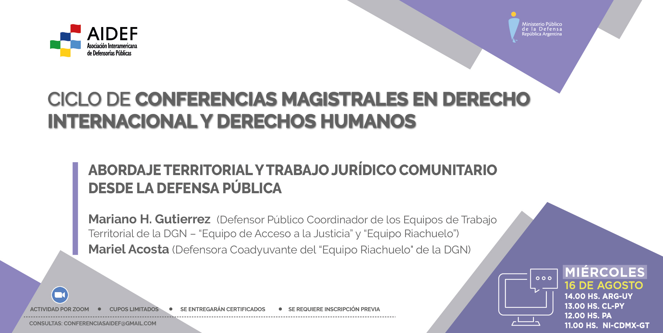 El próximo miércoles 16 de agosto a las 14.00 h (ver horario para otros países en el flyer), el Dr. Mariano H. Gutiérrez, Defensor Público Oficial y coordinador de los equipos de trabajo territorial de la DGN (Equipo de Acceso a la Justicia -Acceder- y Equipo Riachuelo) y la Dra. Mariel Acosta, Defensora Pública Coadyuvante del Equipo Riachuelo de la DGN, brindarán la disertación "Abordaje territorial y trabajo jurídico comunitario desde la Defensa Pública”.