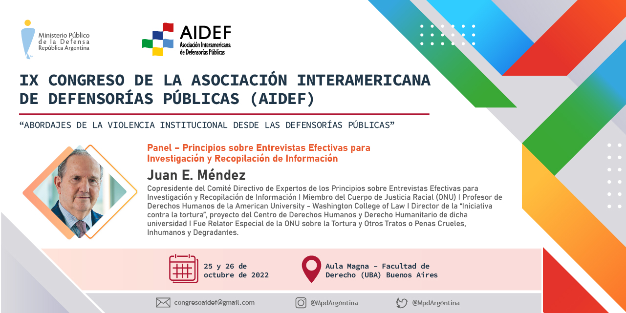 Juan Méndez, ex relator especial de la ONU sobre la Tortura y Otros Tratos o Penas Crueles, Inhumanos o Degradantes, brindará una conferencia magistral durante el IX Congreso de la Asociación Interamericana de Defensorías Públicas (AIDEF), que se desarrollará los próximos 25 y 26 de octubre, bajo el lema “Abordaje de la violencia institucional desde las defensorías públicas”.