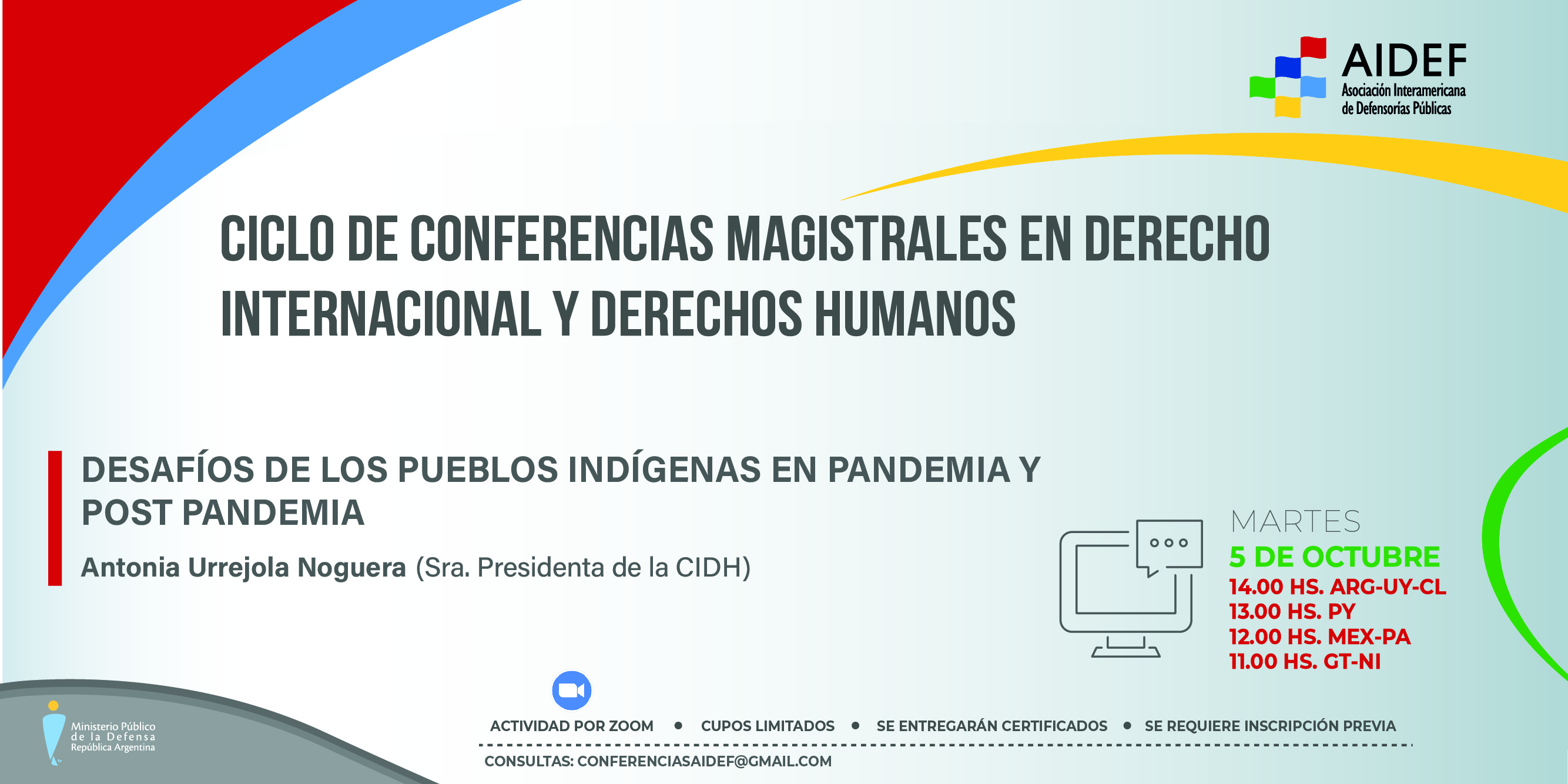 Hoy a las 14 h de Argentina (ver horario para otros países en el flyer), la presidenta de la Comisión Interamericana de Derechos Humanos, Dra. Antonia Urrejola Noguera, brindará la disertación “Desafíos de los pueblos indígenas en pandemia y post pandemia”. La actividad se realizará en el marco del Ciclo de Conferencias Magistrales en Derecho Internacional y Derechos Humanos que organizan en conjunto la Asociación Interamericana de Defensorías Públicas (AIDEF) y el Ministerio Público de la Defensa de la República Argentina (MPD).