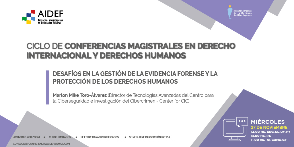 El próximo miércoles 27 de noviembre a las 14 h (ver horario para otros países en la imagen) el Dr. Marlon Mike Toro-Álvarez brindará la disertación “Desafíos en la gestión de la evidencia forense y la protección de los Derechos Humanos”.