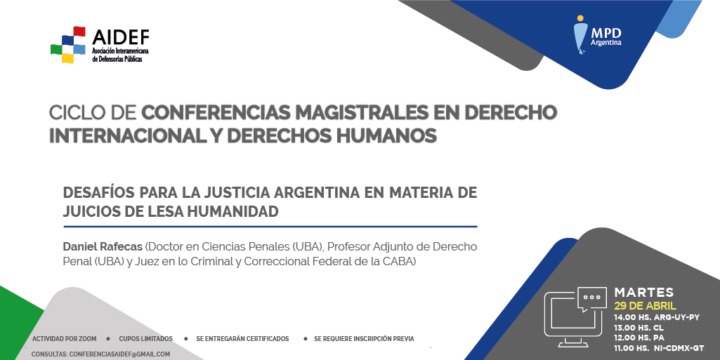 El próximo martes 29 de abril a las 14 h (ver horario para otros países en la imagen) el Dr. Daniel Rafecas brindará la disertación “Desafíos para la Justicia argentina en materia de juicios de lesa humanidad”.
