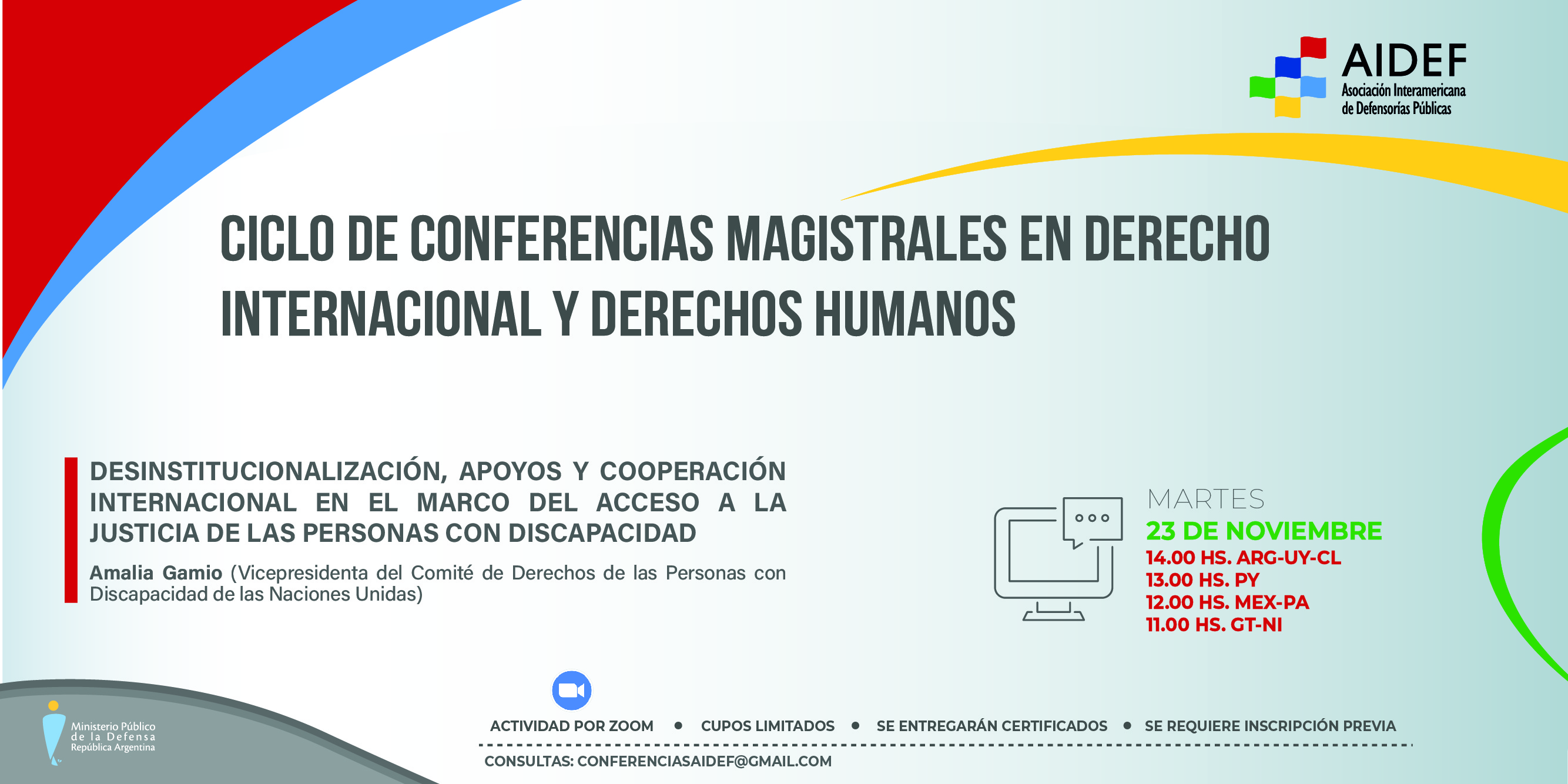 El próximo martes 23 de noviembre a las 14 h (ver horario para otros países en el flyer), la vicepresidenta del Comité de Derechos de las Personas con Discapacidad de las Naciones Unidas, Dra. Amalia Gamio, brindará la disertación "Desinstitucionalización, apoyos y cooperación internacional en el marco del acceso a la justicia de las personas con discapacidad”. La actividad se realizará en el marco del Ciclo de Conferencias Magistrales en Derecho Internacional y Derechos Humanos que organizan en conjunto la Asociación Interamericana de Defensorías Públicas (AIDEF) y el Ministerio Público de la Defensa de la República Argentina (MPD).