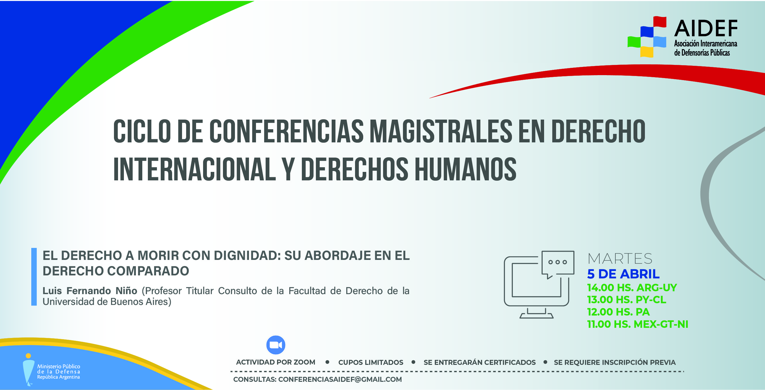 El martes 19 de abril a las 14 h (ver horario para otros países en el flyer), el Dr. Luis Fernando Niño, profesor titular consulto de la Facultad de Derecho de la Universidad de Buenos Aires, brindará la disertación "El derecho a morir con dignidad: su abordaje en el derecho comparado”.