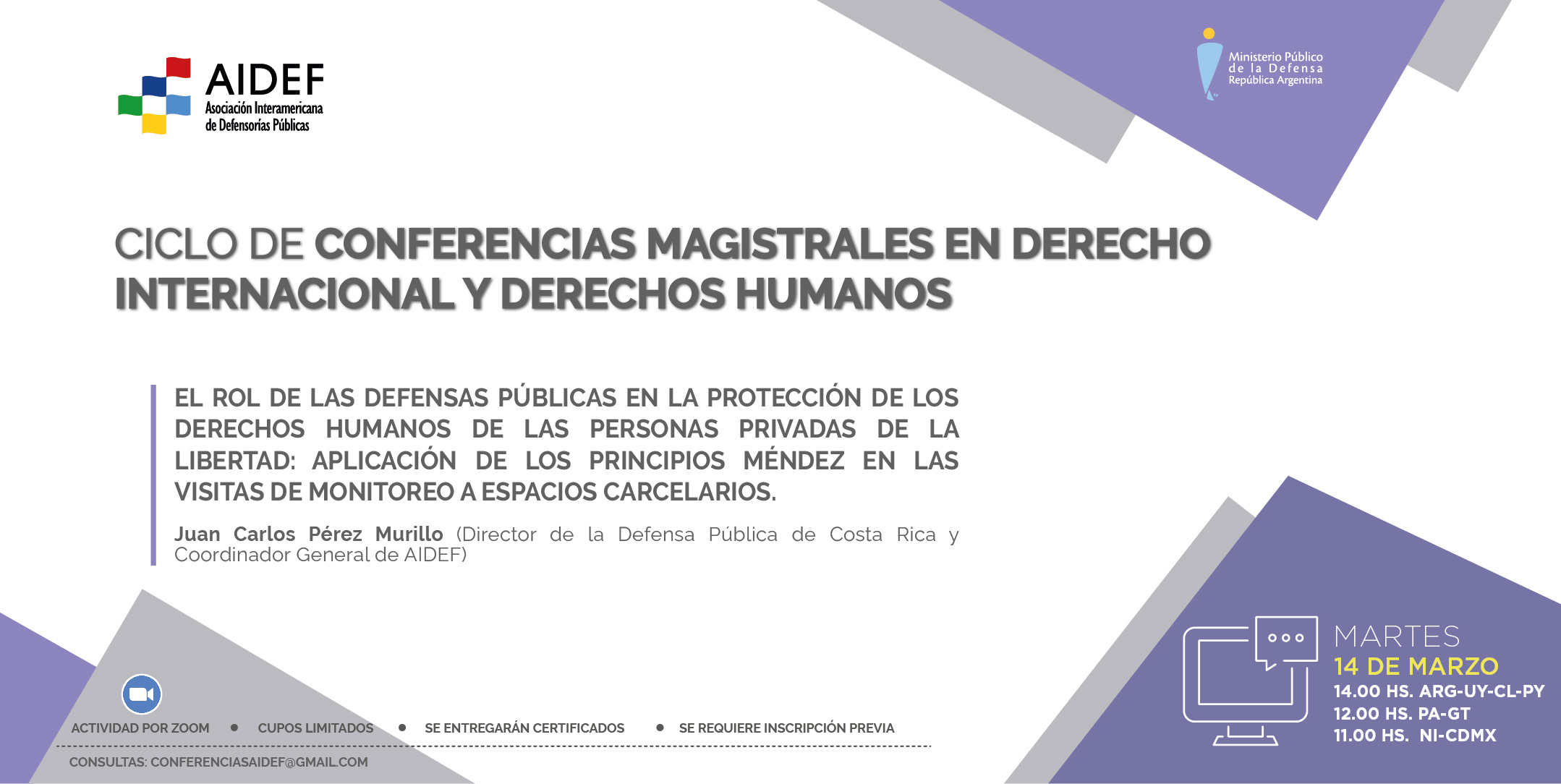 El martes 14 de marzo a las 14 h (ver horario para otros países en el flyer), el Dr. Juan Carlos Pérez Murillo, director de la Defensa Pública de Costa Rica y coordinador general de la Asociación Interamericana de Defensorías Públicas (AIDEF), brindará la disertación “El Rol de las Defensas Públicas en la protección de los derechos humanos de las personas privadas de la libertad: Aplicación de los Principios Méndez en las visitas de monitoreo a espacios carcelarios”.