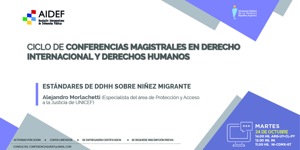 El próximo martes 24 de octubre a las 14.00 h (ver horario para otros países en el flyer), el Dr. Alejandro Morlachetti, especialista del área de Protección y Acceso a la Justicia de UNICEF, brindará la disertación “Estándares de DDHH sobre niñez migrante”.