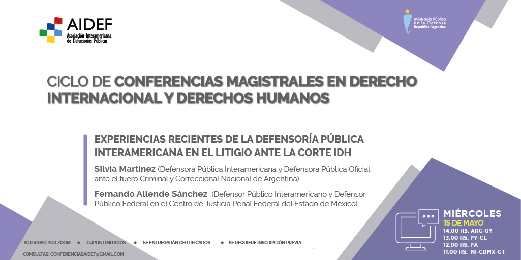 El próximo miércoles 15 de mayo a las 14 h (ver horario para otros países en el flyer) la Dra. Silvia Martínez, Defensora Pública Interamericana y Defensora Pública Oficial ante el fuero Criminal y Correccional Nacional de Argentina, y el Dr. Fernando Allende Sánchez, Defensor Público Interamericano y Defensor Público Federal en el Centro de Justicia Penal Federal del Estado de México, brindarán la disertación "Experiencias recientes de la Defensoría Pública Interamericana en el litigio ante la Corte IDH".