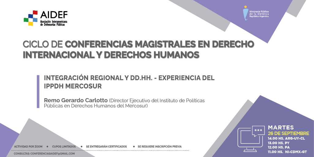 El próximo martes 26 de septiembre a las 14.00 h (ver horario para otros países en el flyer), el Dr. Remo Gerardo Carlotto, Director Ejecutivo del Instituto de Políticas Públicas en Derechos Humanos (IPPDH) del Mercosur; brindará la disertación “Integración Regional y DDHH. Experiencia del IPPDH Mercosur”.
