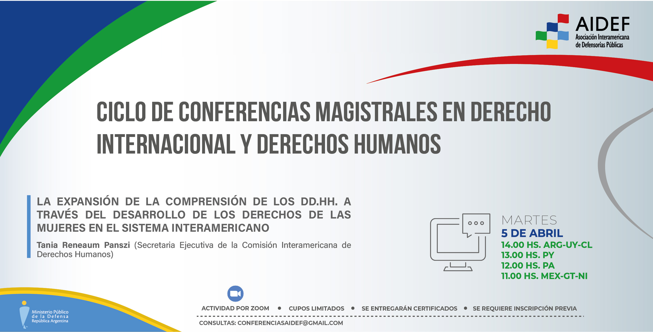 La charla se dará en el marco del Ciclo de Conferencias Magistrales en Derecho Internacional y Derechos Humanos que organizan en conjunto la Asociación Interamericana de Defensorías Públicas (AIDEF) y el Ministerio Público de la Defensa de la República Argentina (MPD).