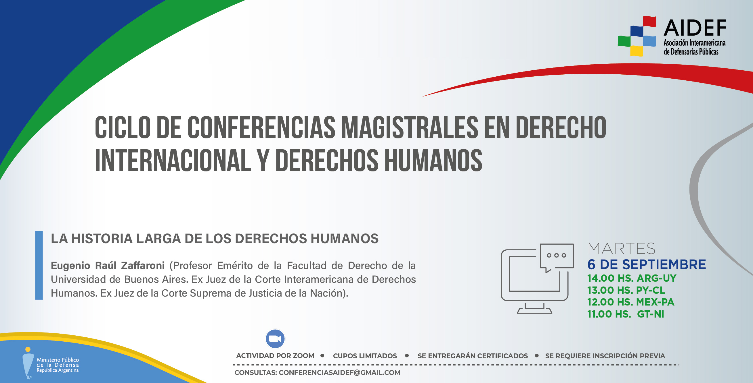 La charla se dará en el marco del Ciclo de Conferencias Magistrales en Derecho Internacional y Derechos Humanos que organizan en conjunto la Asociación Interamericana de Defensorías Públicas (AIDEF) y el Ministerio Público de la Defensa de la República Argentina (MPD).