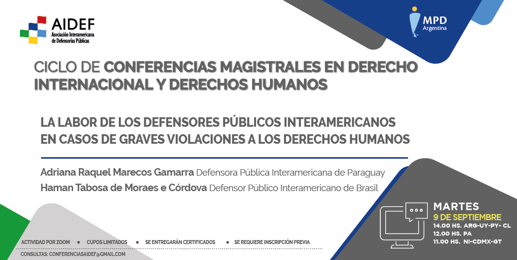 El próximo martes, 9 de septiembre, a las 14 h (ver horario para otros países en la imagen), la Dra. Andriana Raquel Marecos Gamarra, Defensora Pública Interamericana de Paraguay; y el Dr. Haman Tabosa de Moraes e Córdova, Defensor Público Interamericano de Brasil, brindarán la disertación “La labor de los Defensores Públicos Interamericanos en casos de graves violaciones a los derechos humanos”.