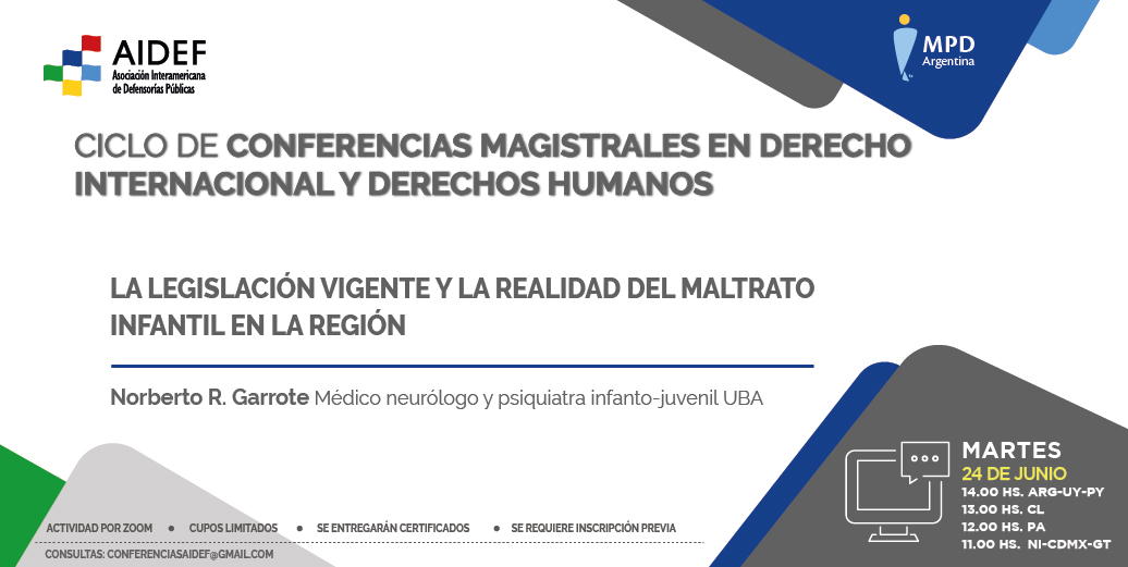 El próximo martes, 24 de junio, a las 14 h (ver horario para otros países en la imagen), el Dr. Norberto R. Garrote, médico neurólogo y psiquiatra infanto-juvenil (UBA), brindará la disertación “La legislación vigente y la realidad del maltrato infantil en la región”.