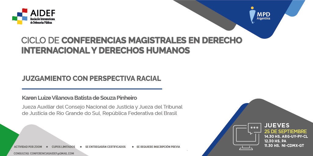 El próximo jueves 25 de septiembre, a las 14.30 h (ver horario para otros países en la imagen), la Dra. Karen Luize Vilanova Batista de Souza Pinheiro, Jueza auxiliar del Consejo Nacional de Justicia y Jueza del Tribunal de Justicia de Río Grande Do Sul, brindará la disertación "Juzgamiento con perspectiva racial".
