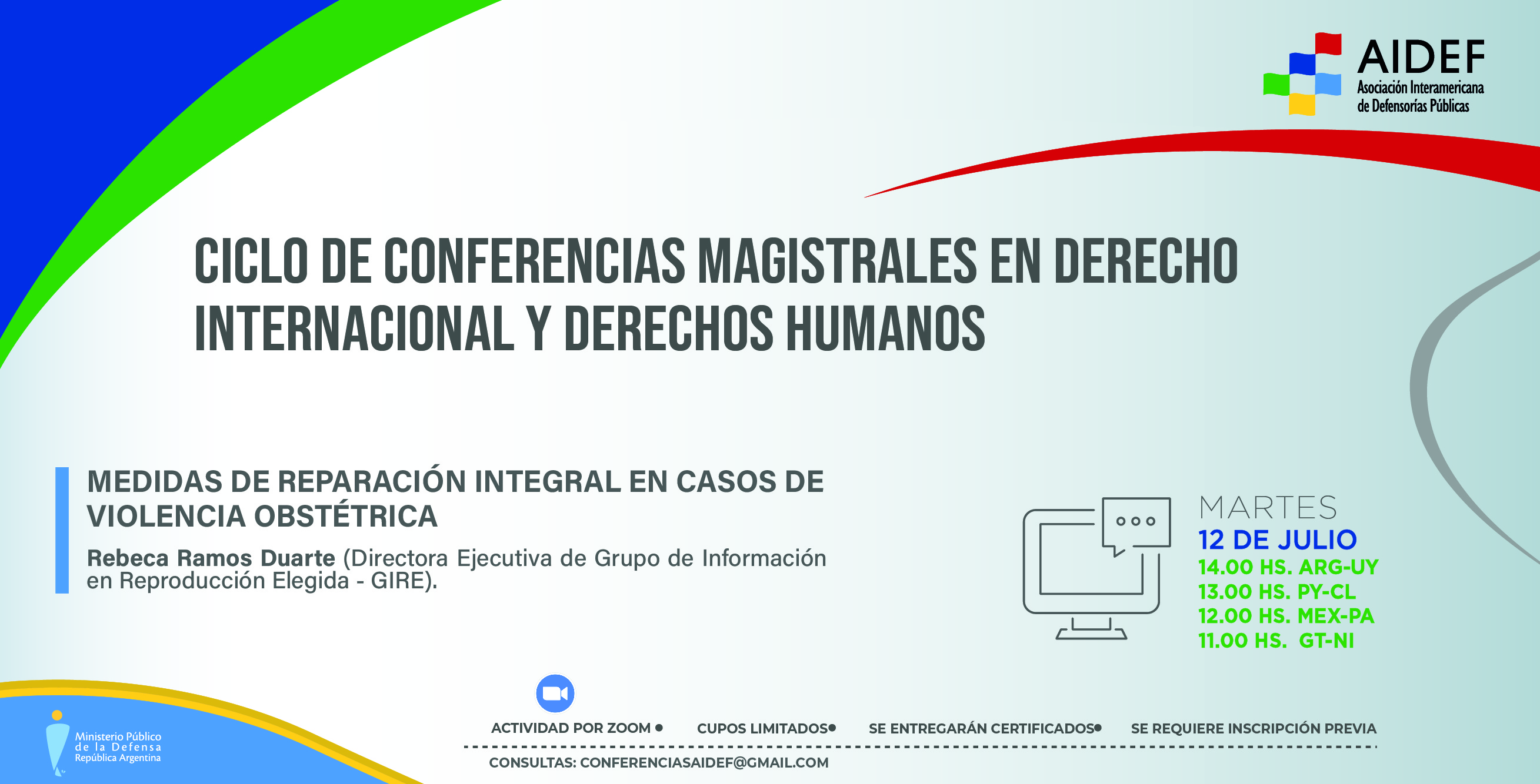 El martes 12 de julio a las 14 h (ver horario para otros países en el flyer), la Dra. Rebeca Ramos Duarte, directora ejecutiva del Grupo de Información en Reproducción Elegida, brindará la disertación "Medidas de reparación integral en casos de violencia obstétrica".