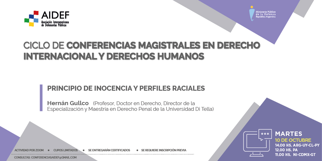 El próximo martes 10 de octubre a las 14.00 h (ver horario para otros países en el flyer), el Dr. Hernán Gullco, Director de la Especialización y Maestría en Derecho Penal de la Universidad Di Tella, brindará la disertación “Principio de inocencia y perfiles raciales”.