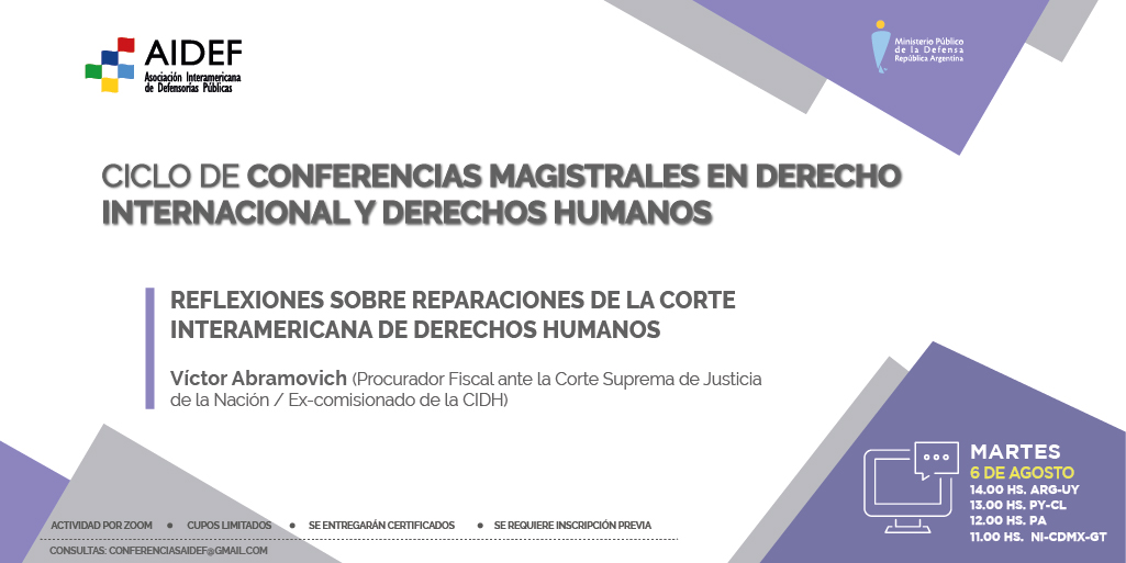 El próximo martes 6 de agosto a las 14 h (ver horario para otros países en el flyer) el Dr. Víctor Abramovich, Procurador Fiscal ante la Corte Suprema de Justicia de la Nación y ex Comisionado de la CIDH, brindará la disertación “Reflexiones sobre reparaciones de la Corte Interamericana de Derechos Humanos".