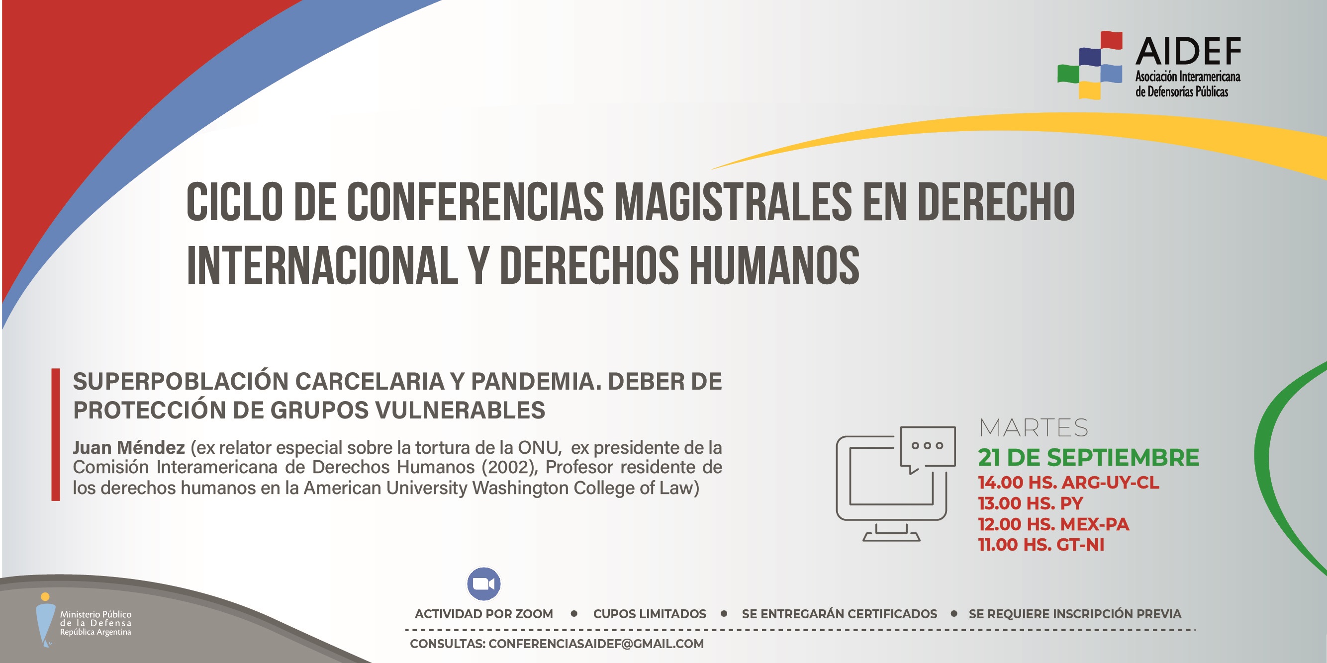 El próximo martes 21 de septiembre a las 14 h de Argentina (ver horario para otros países en el flyer), el ex relator especial sobre la tortura de la Organización de Naciones Unidas, Dr. Juan Méndez, brindará la conferencia “Superpoblación carcelaria y pandemia. Deber de protección de grupos vulnerables”. La actividad se realizará en el marco del Ciclo de Conferencias Magistrales en Derecho Internacional y Derechos Humanos que organizan en conjunto la Asociación Interamericana de Defensorías Públicas (AIDEF) y el Ministerio Público de la Defensa de la República Argentina (MPD).
