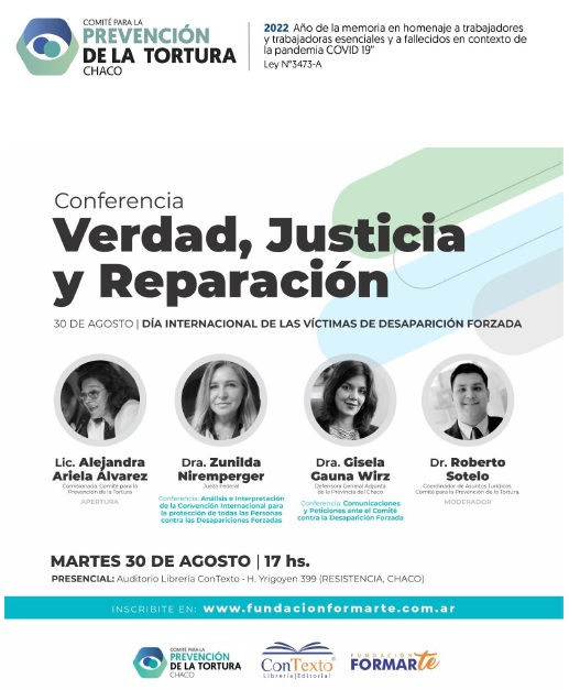 El próximo martes 30 de agosto a las 17 h se realizará la conferencia “Verdad, Justicia y Reparación”, organizada por el Comité Provincial para la Prevención de la Tortura y otros Tratos y Penas Crueles, Inhumanos o Degradantes. En esta ocasión, expondrán la Dra. Zunilda Niremperger, jueza federal; y la Dra. Gisela Gauna Wirz, defensora general adjunta de la Provincia del Chaco. La apertura estará a cargo de la Lic. Alejandra Ariela Álvarez, comisionada del Comité para la Prevención de la Tortura, y el moderador del encuentro será el Dr. Roberto Sotelo, coordinador de Asuntos Jurídicos del Comité para la Prevención de la Tortura.