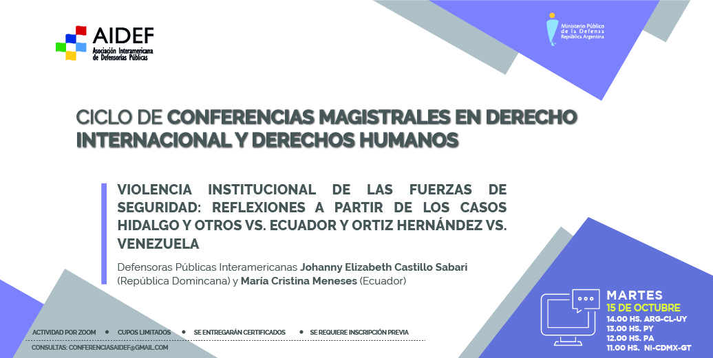 El próximo martes 15 de octubre a las 14 h (ver horario para otros países en la imagen) las Defensoras Públicas Interamericanas Dras. Johanny Elizabeth Castillo Sabari (República Dominicana) y María Cristina Meneses (Ecuador), brindarán la disertación “Violencia institucional de las fuerzas de seguridad: reflexiones a partir de los casos Hidalgo y otros vs. Ecuador y Ortiz Hernández vs. Venezuela".