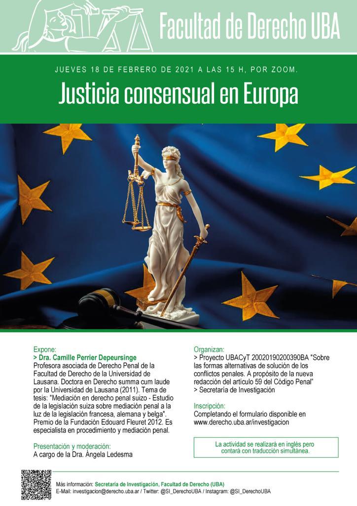 El próximo jueves 18 de febrero a las 15 h se realizará la conferencia “Justicia consensual en Europa”. El evento es organizado por el proyecto UBACyT “Sobre las formas alternativas de solución de los conflictos penales. A propósito de la nueva redacción del artículo 59 del Código Penal”, cuya directora es la Dra. Ángela E. Ledesma, y se llevará a cabo a través de la plataforma virtual Zoom. El Ministerio Público de la Defensa brindó auspicio a esta actividad mediante la Resolución DGN N° 108/21.